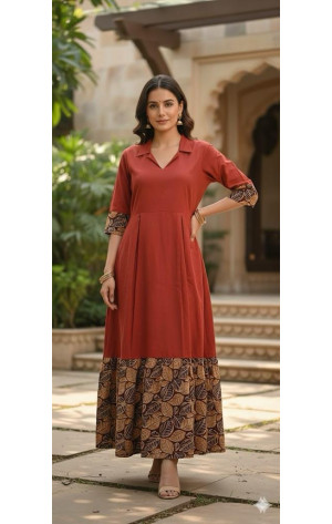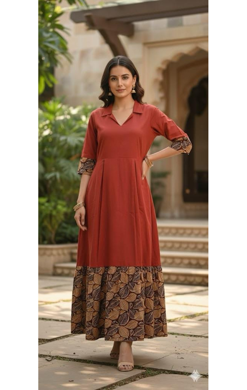• Brick colour plain dress with leaves block print fabric bottom panel